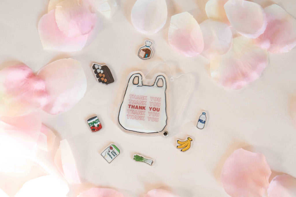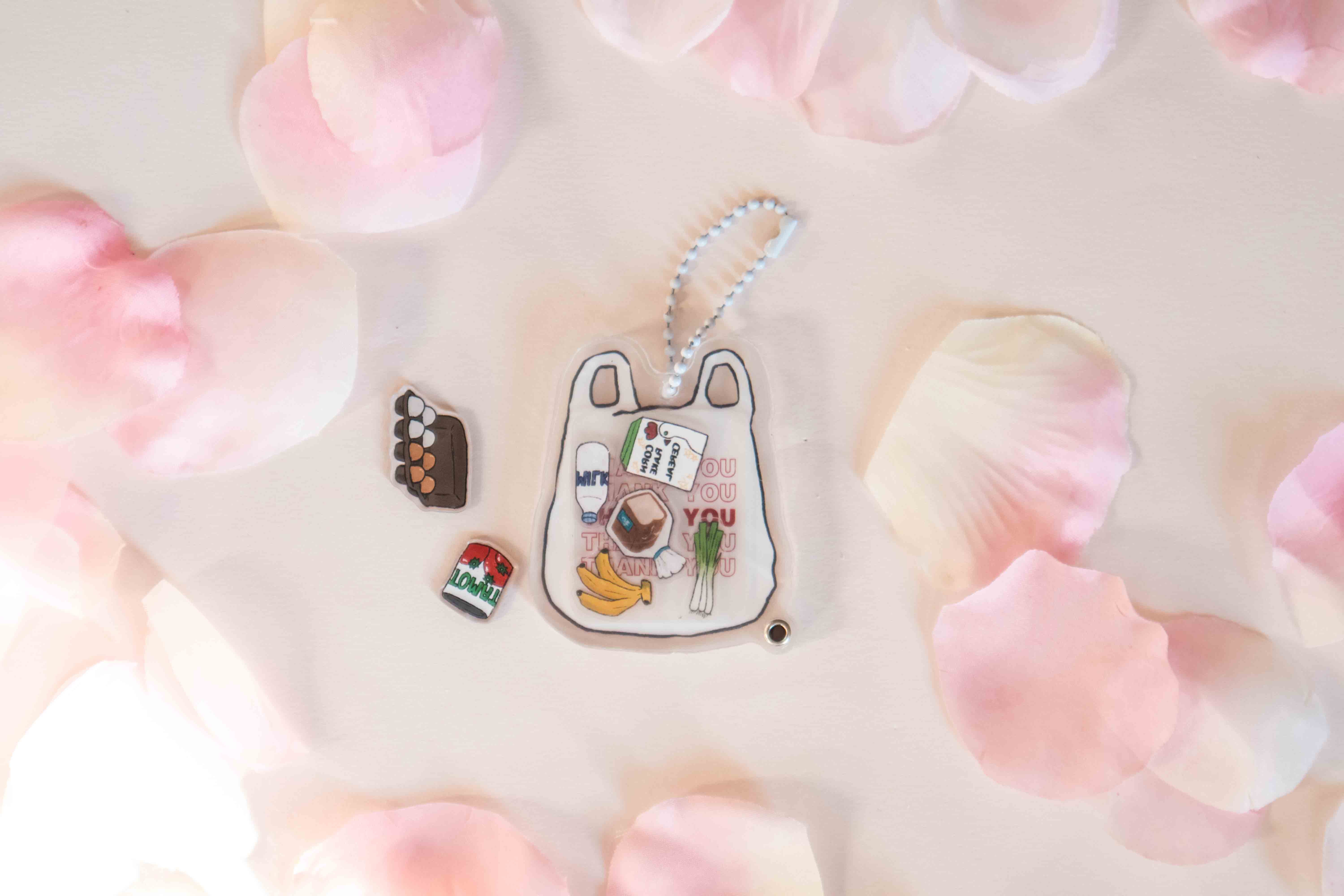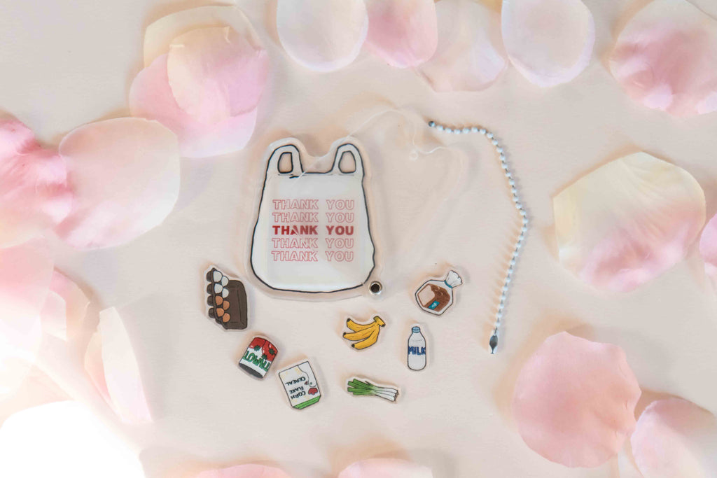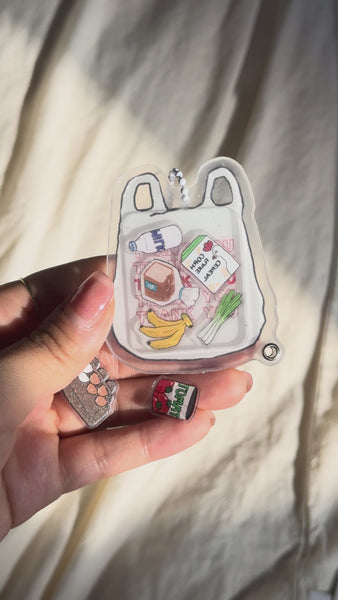 The grocery bag shaker is openable from the ball chain. Open the shaker and fill it with your favorite fillers! The shaker comes with all of the filler charms in the photos.